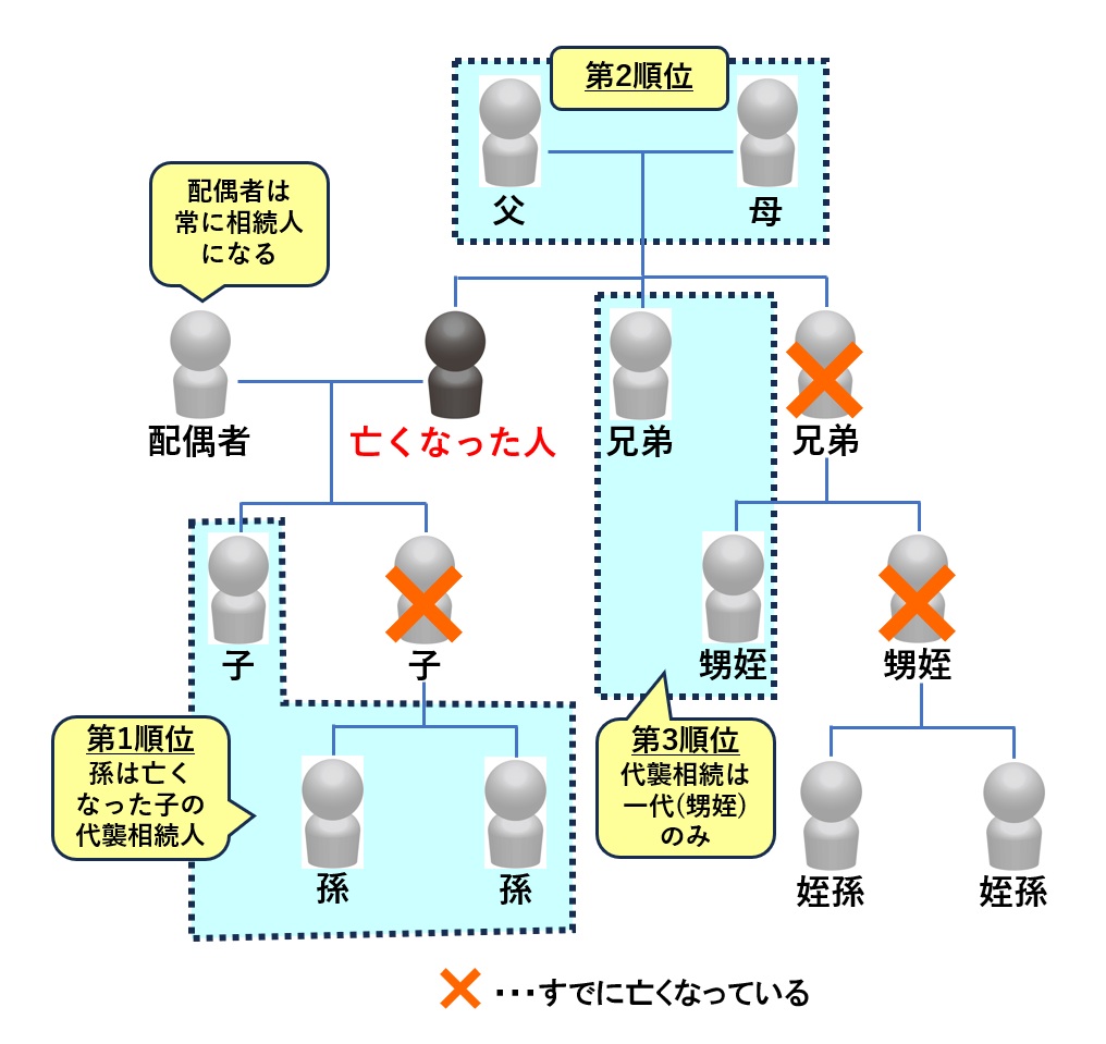 亡くなった人の子がすでに亡くなっている場合はその人の子(孫)、その人の子も亡くなっている場合はさらにその人の子(ひ孫)が代わりに相続人になります。(代わりに相続人になることを「代襲相続」といいます)