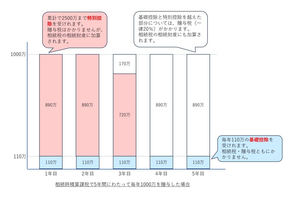 贈与税①毎年110万円の基礎控除を受けることができます。②110万円を超える贈与について、累計で2500万円まで特別控除を受けることができます。③基礎控除および特別控除を超えた部分に対して一律20%の贈与税がかかります。相続税相続財産に上記①の基礎控除分を除いた残額を加算して、相続税額を計算します。※すでに支払った贈与税相当額は相続税額から控除します。